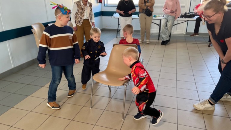 Après le temps calme, place à l’énergie ! Anne-Marie a entraîné petits et grands dans un incontournable jeu des chaises musicales. Comme toujours, ce n’est pas forcément le plus fort qui l’emporte… mais souvent le plus malin ! Le tout orchestré par Maxime, qui a su trouver les airs musicaux pour maintenir l’ambiance.